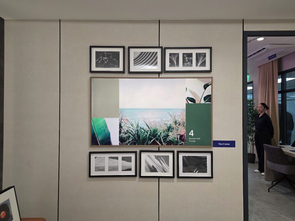 Personally, I was floored with the bedroom demo that doubled as both hotel and home setups. It was the first time for me to see The Frame, a specialized Samsung Smart TV that is powered by a matte QLED screen, meaning it doesn’t reflect glare and protects the screen from burn-in. The overall result is I had thought the TV was a still painting until the screen moved using your Samsung phone as a remote. On idle, the TV doesn’t turn off but displays a random work of art.