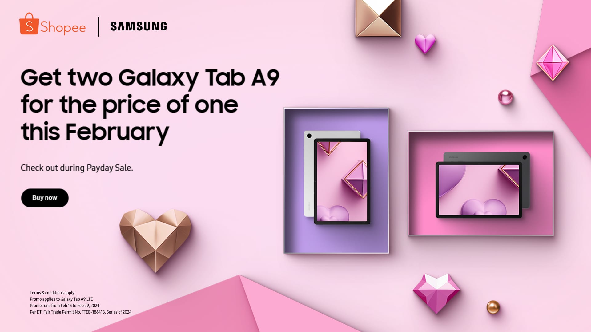 Don’t miss this chance to double the fun with the Galaxy Tab A9 LTE awards! Bring home TWO Galaxy Tab A9 LTE for the price of one, from February 26 to 29, 2024. The promo is exclusively available on select Samsung Online Stores Lazada, Shopee and TikTok.
