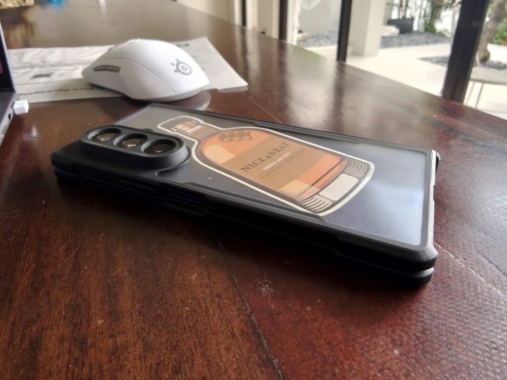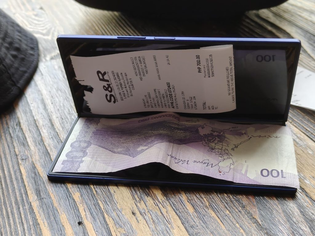 When I go on my usual bike rides during the weekend, I stick a bill or two inside the fold so I have cash in that rare case that my go-to coffee shops aren’t accepting GCash or Maya. The Fold7 creates a near-perfect seal when fully folded to the extent that you can hold the phone dangling by the receipts, depending on the texture of the paper. Does that make it … folded, and hung?
