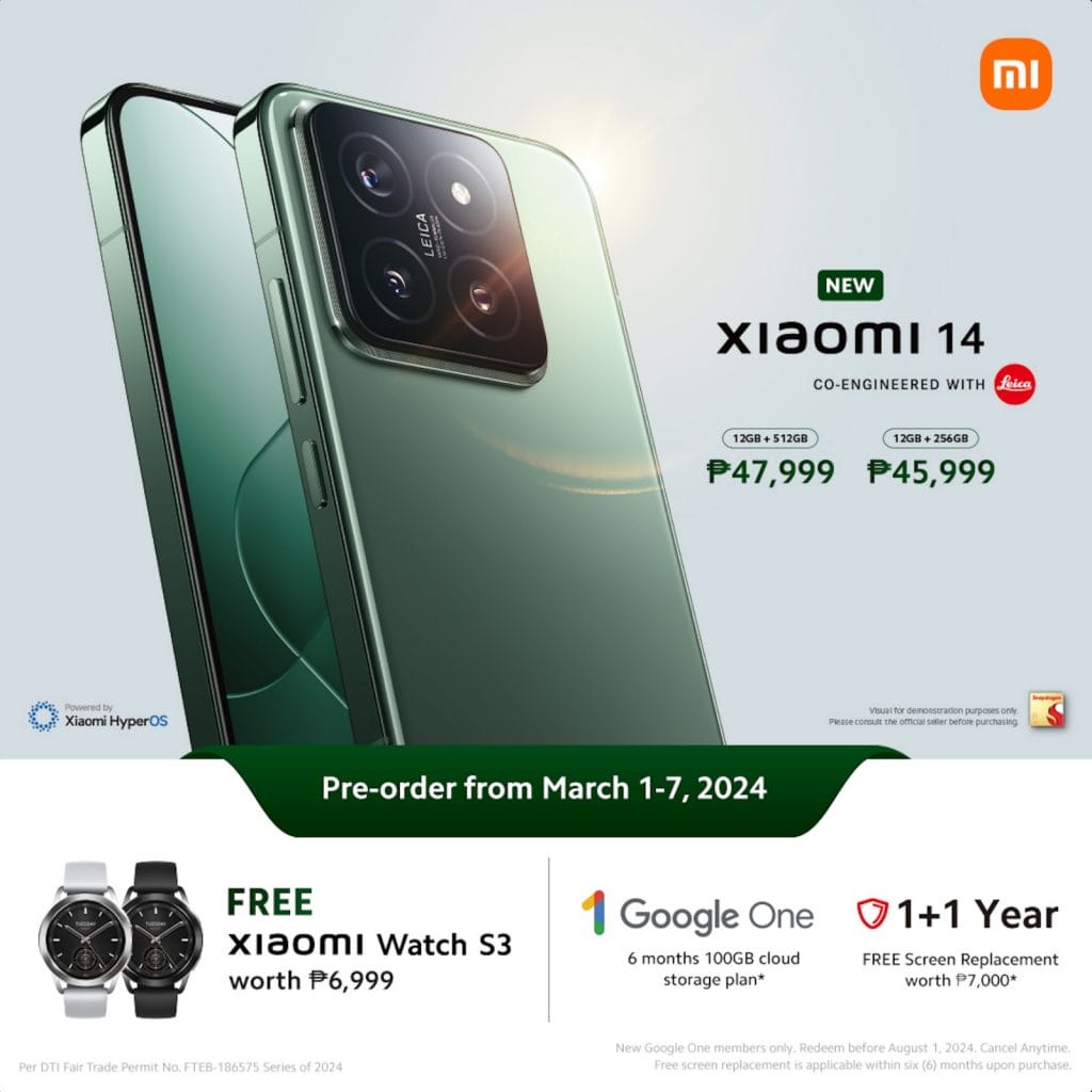 The first-day sale for Xiaomi 14 at authorized Xiaomi stores and retailers nationwide will be in March. It will also be available on e-commerce platforms Lazada and Shopee. When customers pre-order from March 1 to 7, they get a free Xiaomi Watch S3 and 6 months of 100GB cloud storage from Google One. The promo also comes with a 1+1 year warranty with free screen replacement worth P7,000.
