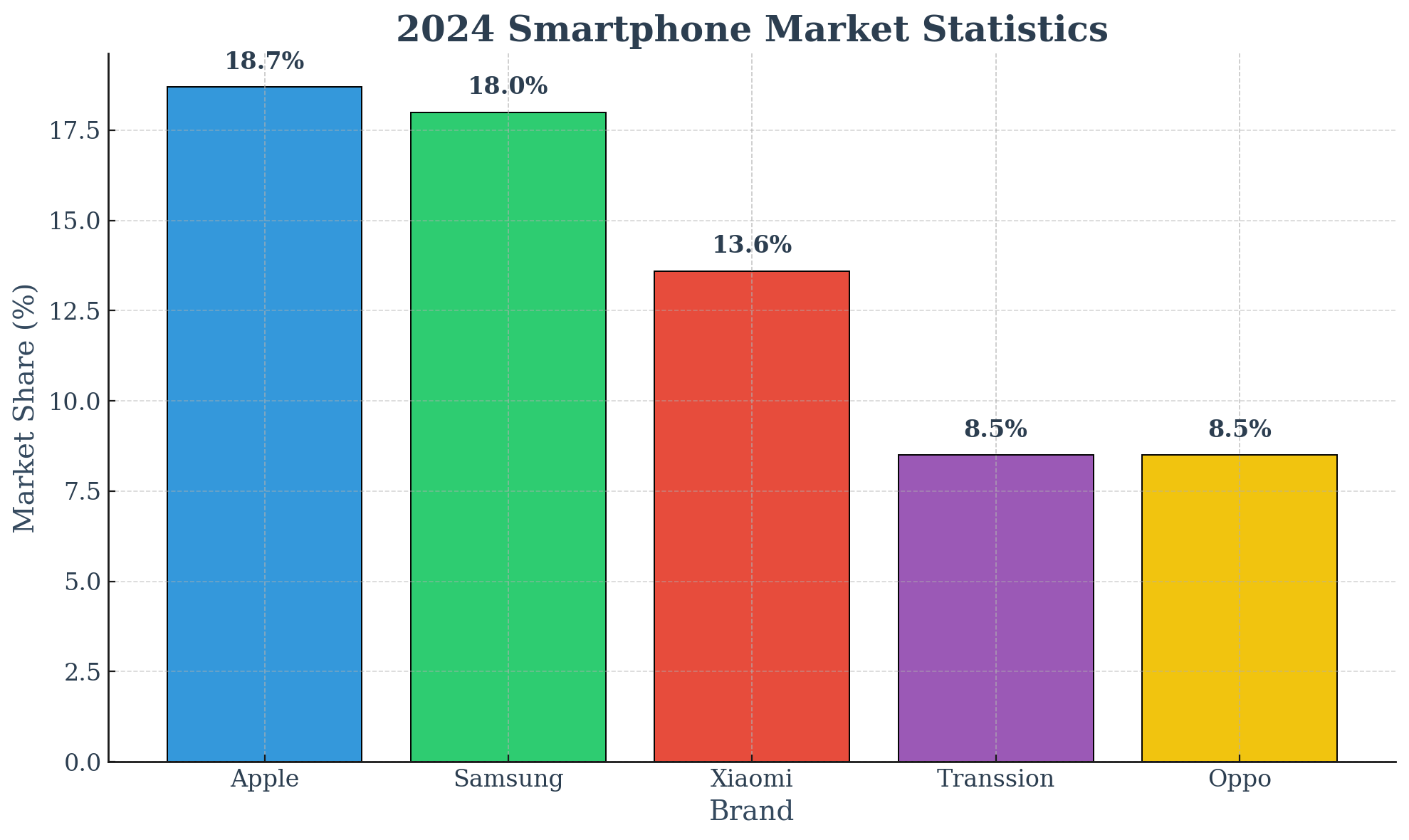 For the entire year, Apple led the market with an 18.7% share, followed closely by Samsung at 18%. Xiaomi held 13.6% of the market, reflecting its growing influence. Notably, Transsion and Oppo tied for the fourth position, each with approximately 8.5% market share.