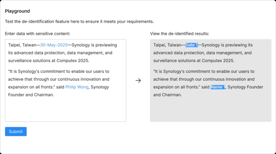 Moreover, the built-in de-identification capabilities automatically redact sensitive information based on company policies before any data is transmitted to third-party AI services. All AI usage activities are fully recorded with transaction and admin logs for auditing purposes.