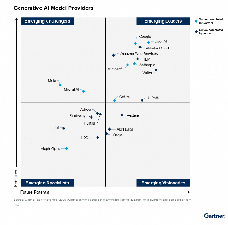 According to Gartner, the Emerging Market Quadrant provides “a visualization of generative AI vendors” in a “dynamic and fast-moving market,” and “Emerging Leaders typically possess visibility within the market as well as both strong features and future potential”.
