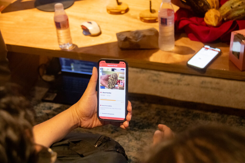 One example is a cacao scanner application that uses artificial intelligence (AI) to detect diseases in cacao plants, allowing farmers to assess crop health more efficiently. Developed at a prototype level, it has already seen use within local communities, alongside similar tools such as a rice disease monitoring app.