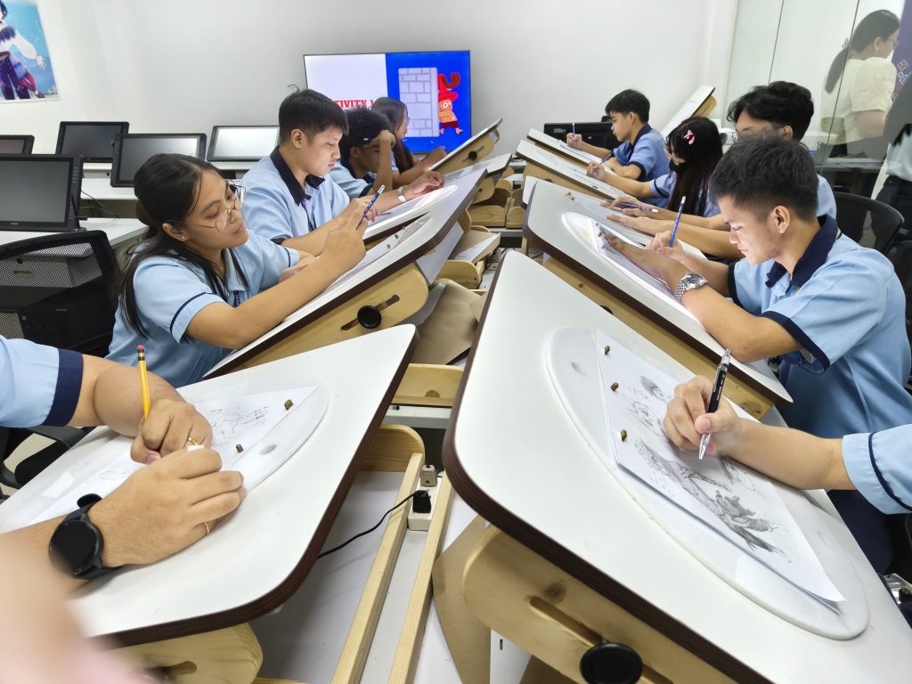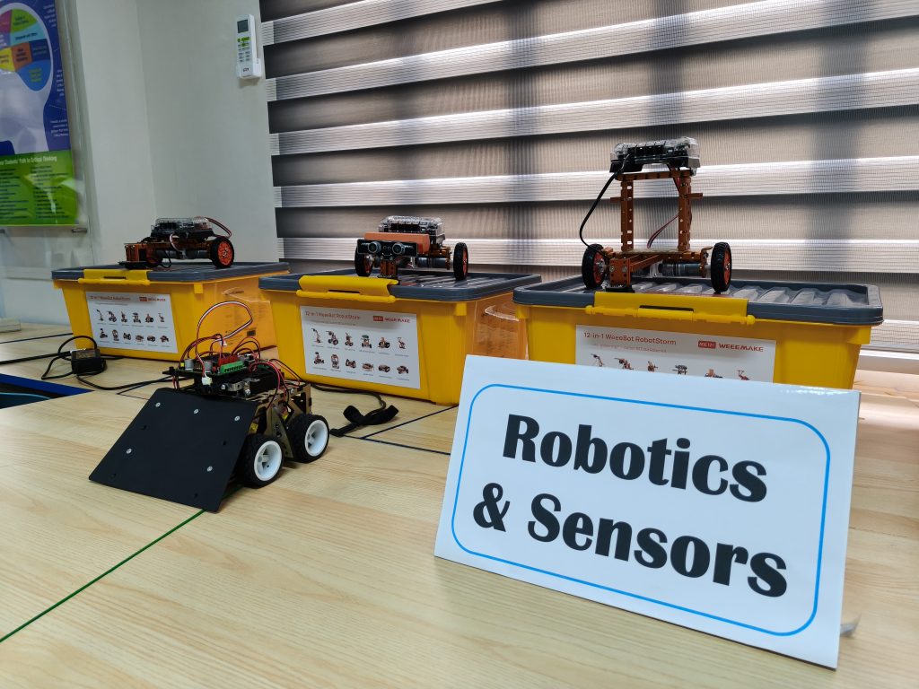 Inside, the setup departs from the traditional rows of chairs and blackboards. Instead, the space features robotics kits, drones, virtual reality headsets, and laptops.