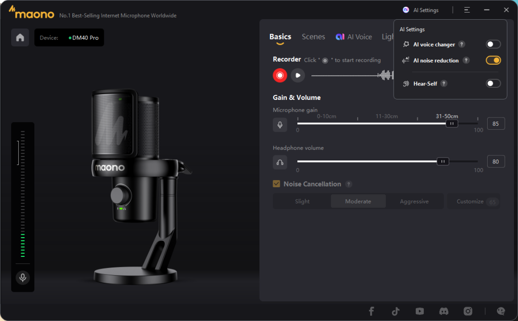 Mic setup was also one of my concerns because, as a streamer (or at least a VTuber) in the Philippines, heat is always an issue during summer. You’d always have a fan nearby, and that audio gets picked up. You’d tinker with your device’s noise cancellation settings or maneuver your fan to a spot where you still get cooler while the device doesn’t pick it up. But lo and behold, the Maono DM40 Pro had four noise cancellation settings, Slight, Moderate, Aggressive, and even a customizable level. What surprised me more was that, while I couldn’t adjust the noise cancellation to optimize my current situation manually, the AI noise reduction toggle in my Maono Link app actually improved my sound quality to the point where I didn’t need to use an app like Voicemod to clean it up.