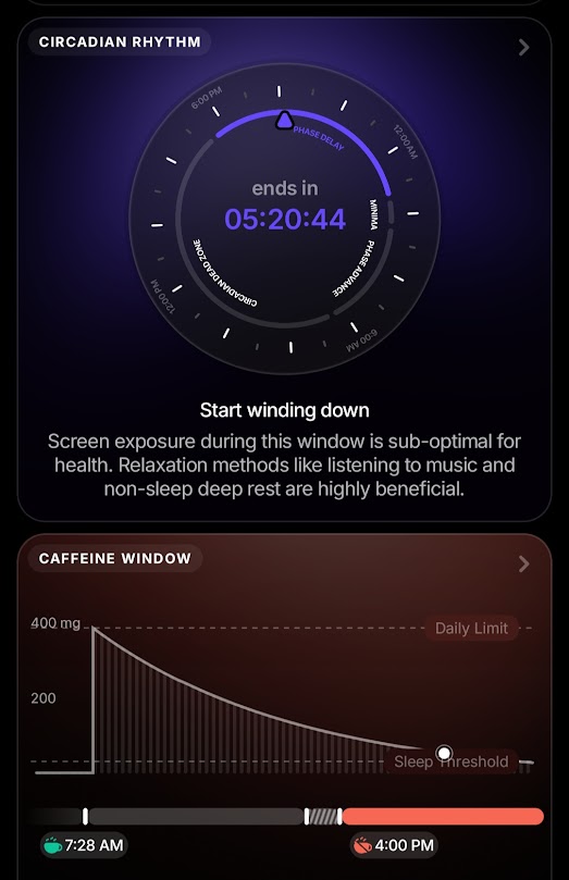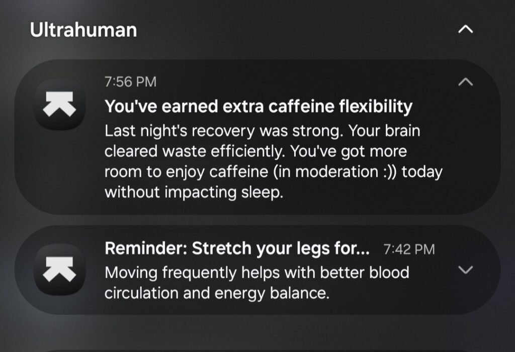 Based on the Ultrahuman app ecosystem it looks like there’s a push to release both free and paid apps called “Powerplugs” that add a variety of monitoring options. So far I have installed a few that can monitor Vitamin D intake from sunlight exposure, Circadian alignment monitoring based on sleep tracking, Caffeine Window that looks at coffee intake vis a vis time, and Social Jetlag that is essentially an introvert’s recharge clock. There are many other apps that are situational such as one for new parents and menstrual cycle and ovulation for women. This ecosystem is really what gives me more confidence in Ultrahuman’s long term goal of truly understanding one’s body.