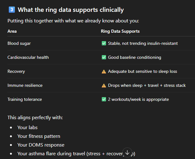 If you’re considering one to track accurate steps, this is not for you, as it under-reports steps compared to the Apple Watch 11 by roughly 25-30%. If you want to track sleep progress, a ring is more convenient than a watch. It’s more convenient to wear 24/7 as its IP rating can withstand water from washing dishes and baths. That means it can give better resting heart rate data, which was a peeve of mine with smart watches since I usually remove my watch when I get home from work. That being said, the Ultrahuman Ring Air data works well with your favorite AI LLM and is in fact more convenient to use because of the way it is set up. With Ultrahuman, data is stored in the cloud, and if I want to access or download my data, I simply login to Ultrahuman Vision on my browser and I can download everything as a CSV file. This data can be uploaded to ChatGPT (any LLM will do, it’s just that I use this the most for health data).